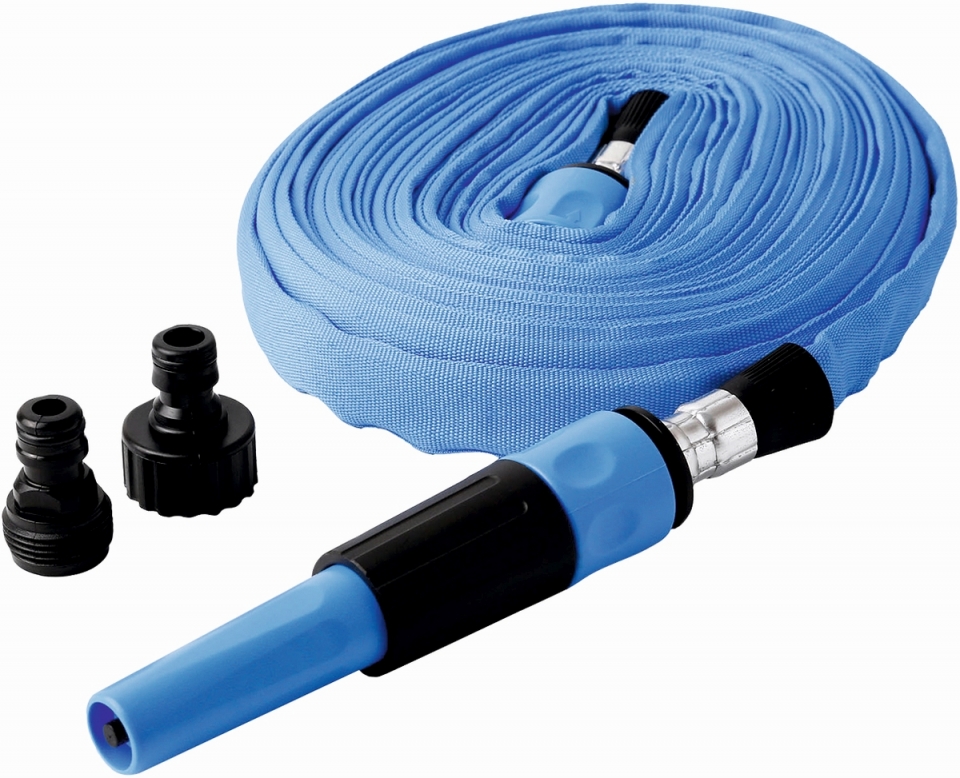 Plochá hadice z robustního materiálu odolného proti roztřepení. Kompletní se spojovacími díly. Délka hadice 9m.