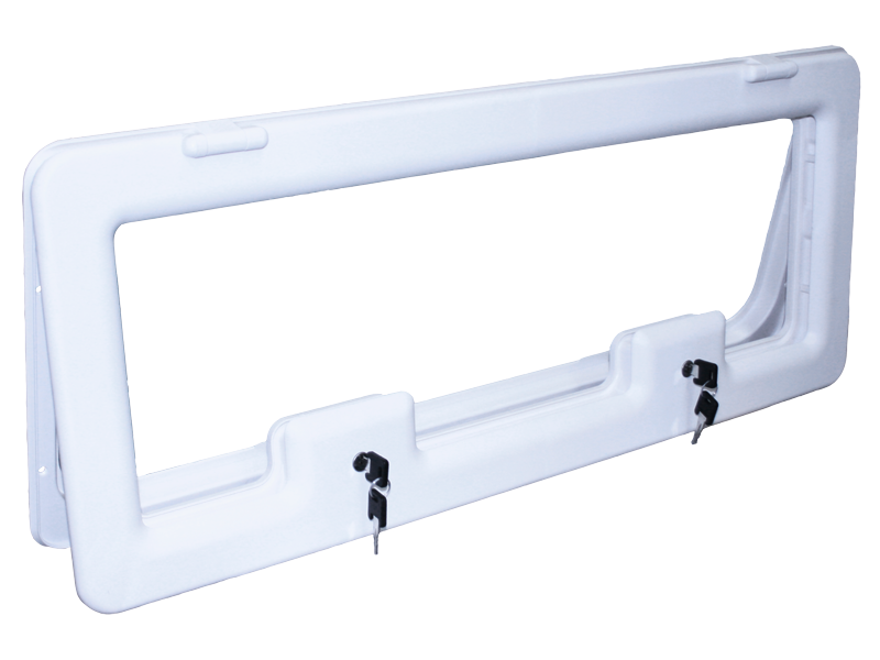 Rám vyrobený z vysoce kvalitního plastu odolného vůči povětrnostním vlivům, se 2 zámky a klíčem pro zhotovení vnější klapky. Výřez se vkládá do chlopně jako výplň. Vnější rozměr 840 x 345 mm, rozměr výřezu 800 x 300 mm, čistý rozměr 780 x 280 mm. Barva bílá.